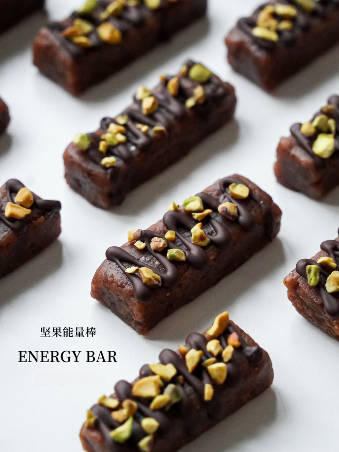 4. Melt dark chocolate (about 50g) over a double boiler. Drizzle over the energy bars and sprinkle with chopped pistachios for decoration.