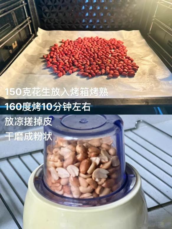 2.Put 150g peanut kernels into the oven,bake them at 160° for about 10 minutes.Once cooled,rub off the peanut skins and grind the peanut into powder.