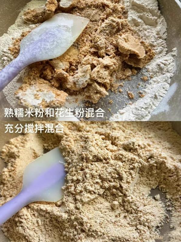 3.Thoroughly mix the cooked glutinous rice flour with the peanut powder.