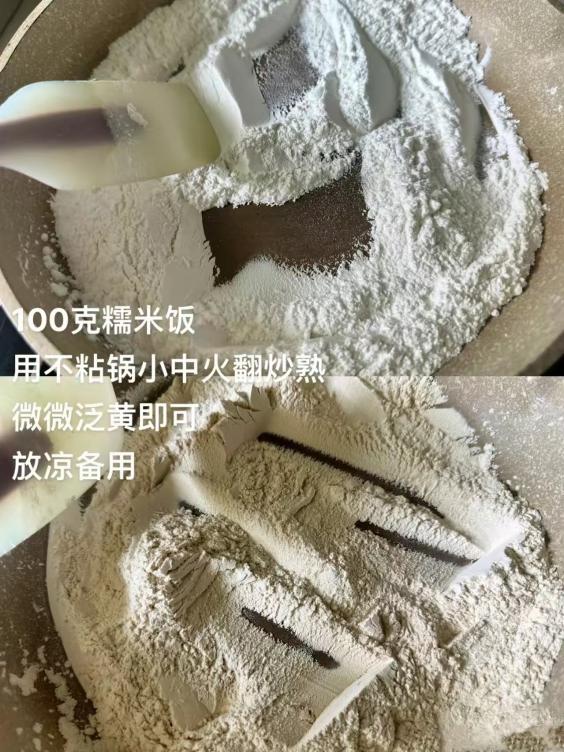 1.Take 100g of glutinous rice flour and stir-fry it in a non-stick pan over low to medium heat until it turns slightly yellow.Let it cool down and set aside for later use.