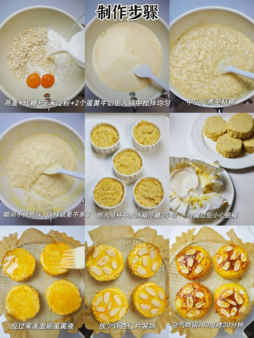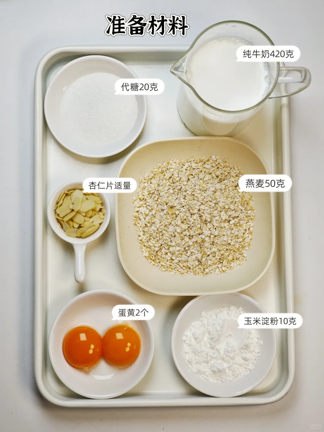 Material Preparation:oats 50g, milk 420g, sugar substitute 20g, cornstarch 10g,2 egg yolks, almond slices as needed