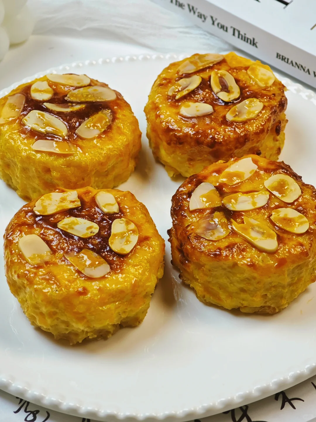 3.After refrigeration, brush a layer of egg yolks liquid on the surface, sprinkle an appropriate amount of sliced almonds for decoration, then bake in an air fryer at 180°C for 20 minutes and it’s done.
